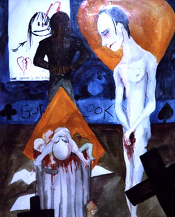 This winner shows a castrated man staring a garbage can of dead babies. Charming. My mother cut the bottom off the painting so it would fit into a store bought frame. I'm still surprised she found it worthy to hang on her walls. I apologize for the glare from the photography.