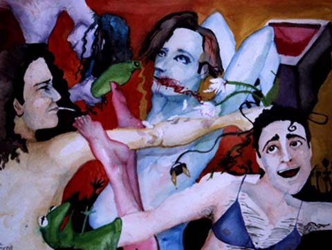 This watercolor (1992) was painted of some of my friends having fun when I lived at my Grant st. address. The pink feet were indended to be mine. The guy in the bra is supposed to be Jared Bryant. The likenesses are terrible.