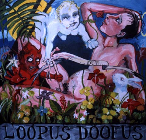 It is entitled "loopus doofus" (1992) and it is acrylic on canvas. My mother had it hanging in her family room for two years before she noticed the stretched out weenie.