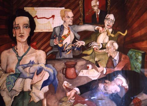 I appologize for the glare from the photography. This was my first painting finished in Boston, after I started the office life. It's called "Office fight 1" (1994). Twitch had choses this as thier cover for their never released RCA CD. Production went as far as a total sleeve layout. The album, and subsequently the cover, was pulled weeks before its release as RCA had a huge management change.